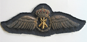 A separate Danish navy aviation school (Marinens Flyveskole) was launched in 1913 and the Naval air service (Marinens Flyvevæsen) was established in 1923. The first pattern Naval pilot wing was a winged fouled anchor surmounted by the Danish royal crown embroidered in gold bullion on black wool and dates from 1915.