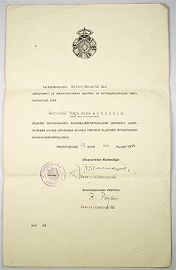 Official graduation and award document for the radio/gunner badge awarded to Corporal Viljo Ensio Lundelin on 12th August 1942. You can see where the badge was punched through the document in the upper left corner.