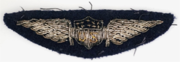 The grandaddy of all aeronaut badges. The first government issue regulation Aeronaut badges were made in silk, rather than silver wire embroidery as for heaver-than-air aviators. The prescribed double wing badge was to have: "A balloon with letters US and basket at the center, to be of white silk on dark blue wool felt; the letters to be golden (silk) thread.